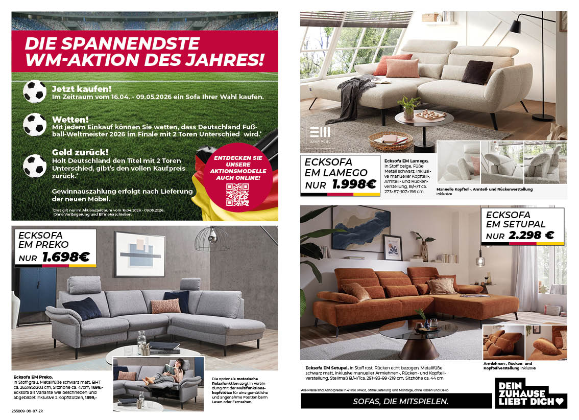Der Kunde wettet mit Ihnen im Aktions-Zeitraum vom 16.04. - 09.05.26, dass Deutschland bei der Fußball WM Weltmeister wird UND im Finale mit mindestens 2 Toren Unterschied gewinnt. (In der regulären Spielzeit, ohne Verlängerung und Elfmeterschießen) Tritt dieser Fall ein, bekommen alle Kunden, die im Aktions-Zeitraum bei Ihnen eine Polstergarnitur gekauft haben, den kompletten Betrag ihres Einkaufs zurück.