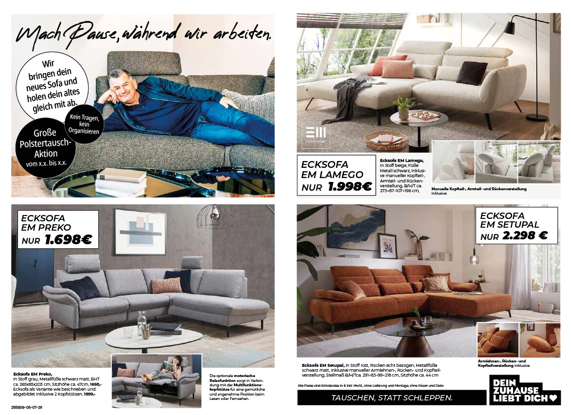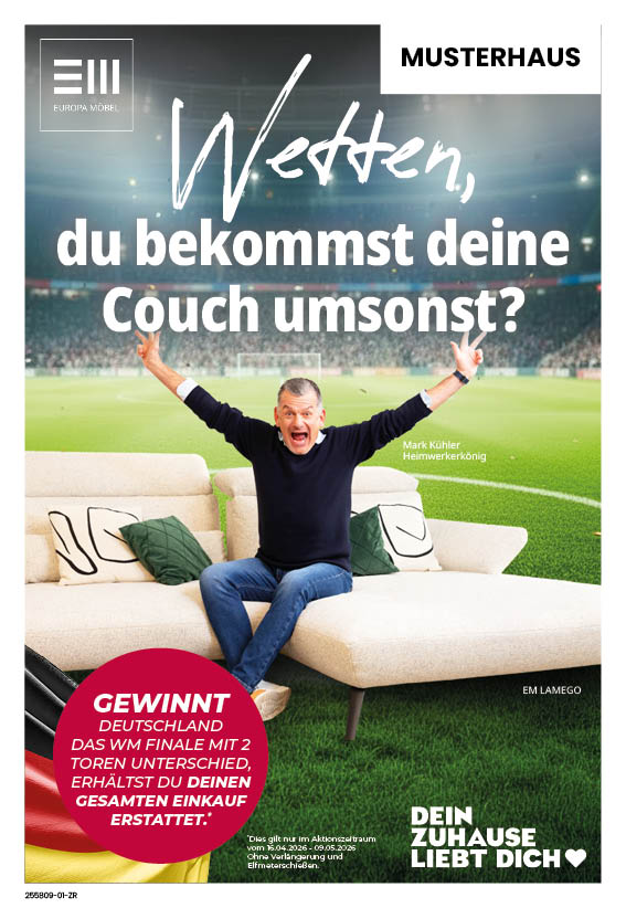 Mit der EMC „WM‑Wette“ bieten Sie Ihren Kundinnen und Kunden ein echtes Highlight: Wird Deutschland bei der Fußball WM Weltmeister UND gewinnt im Finale mit mindestens 2 Toren Unterschied (In der regulären Spielzeit, ohne Verlängerung und Elfmeterschießen), bekommen alle Kunden, die im Aktions-Zeitraum bei Ihnen eine Polstergarnitur gekauft haben, den kompletten Betrag ihres Einkaufs zurück.
