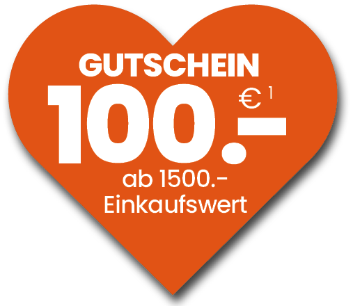 1) Nur gültig bis 31.01.2026. Gilt nicht für bereits reduzierte Sonderpreise, keine Auszahlung möglich, pro Möbel nur ein Gutschein einlösbar. Nur auf Neubestellungen und nicht auf laufende Kaufverträge anwendbar. *Alle Preise sind Abholpreise in € inkl. MwSt.; ohne Lieferung und Montage; ohne Deko. Preise und Produkte sind gültig bis 31.01.2026.