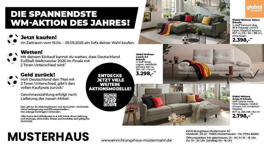 Der Kunde wettet mit Ihnen im Aktions-Zeitraum vom 16.04. - 09.05.26, dass Deutschland bei der Fußball WM Weltmeister wird UND im Finale mit mindestens 2 Toren Unterschied gewinnt. (In der regulären Spielzeit, ohne Verlängerung und Elfmeterschießen) Tritt dieser Fall ein, bekommen alle Kunden, die im Aktions-Zeitraum bei Ihnen eine Polstergarnitur gekauft haben, den kompletten Betrag ihres Einkaufs zurück.
