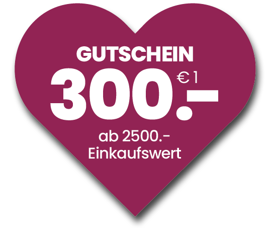 1) Nur gültig bis 31.01.2026. Gilt nicht für bereits reduzierte Sonderpreise, keine Auszahlung möglich, pro Möbel nur ein Gutschein einlösbar. Nur auf Neubestellungen und nicht auf laufende Kaufverträge anwendbar. *Alle Preise sind Abholpreise in € inkl. MwSt; ohne Lieferung und Montage; ohne Deko, Preise und Produkte sind gültig bis 31.01.2026.