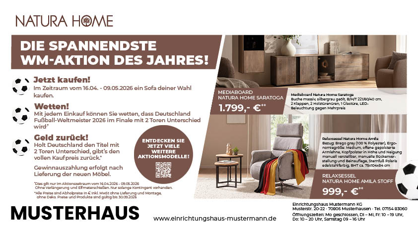 Mit der Natura Home „WM‑Wette“ bieten Sie Ihren Kundinnen und Kunden ein echtes Highlight: Wird Deutschland bei der Fußball WM Weltmeister UND gewinnt im Finale mit mindestens 2 Toren Unterschied (In der regulären Spielzeit, ohne Verlängerung und Elfmeterschießen), bekommen alle Kunden, die im Aktions-Zeitraum bei Ihnen eine Polstergarnitur gekauft haben, den kompletten Betrag ihres Einkaufs zurück.